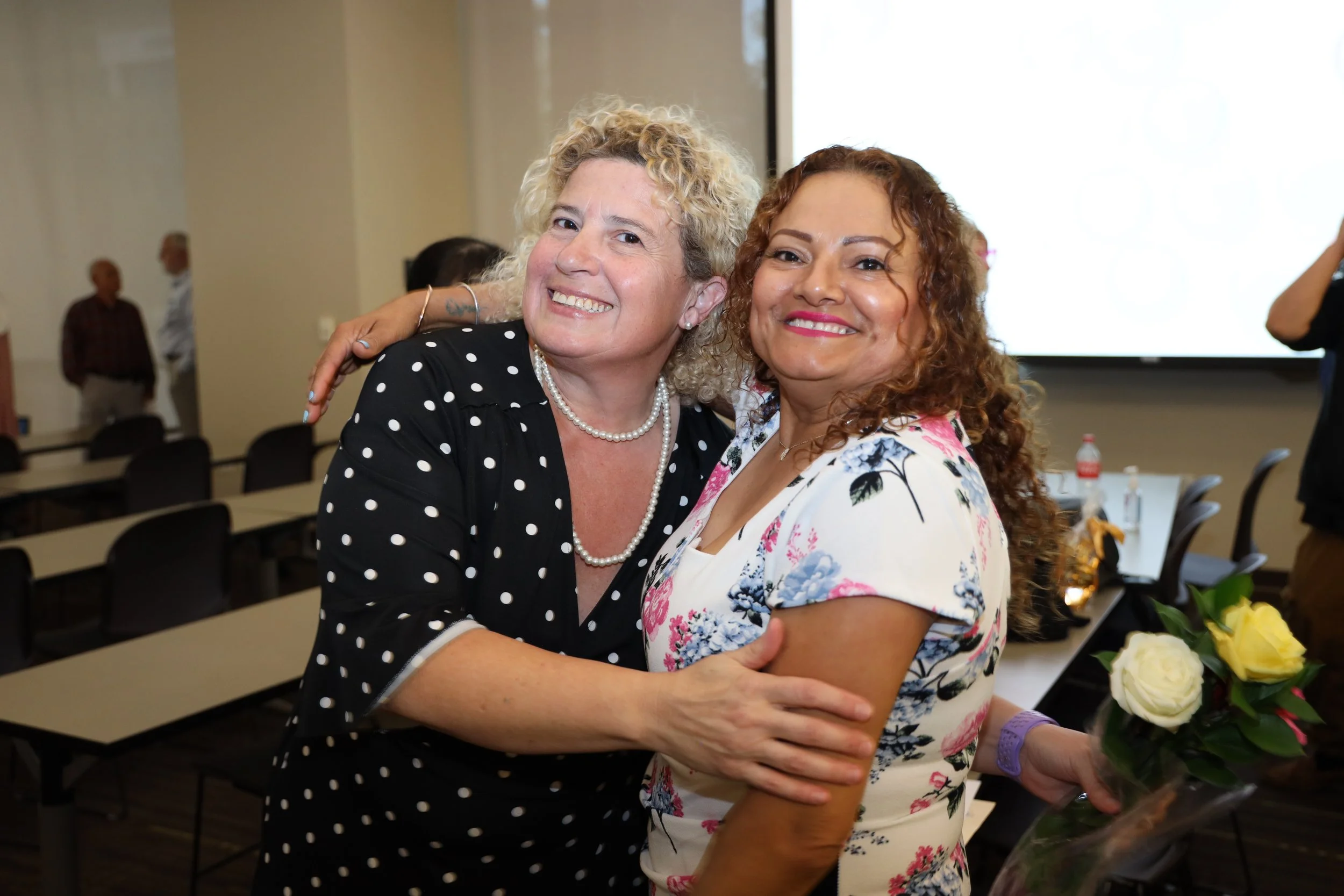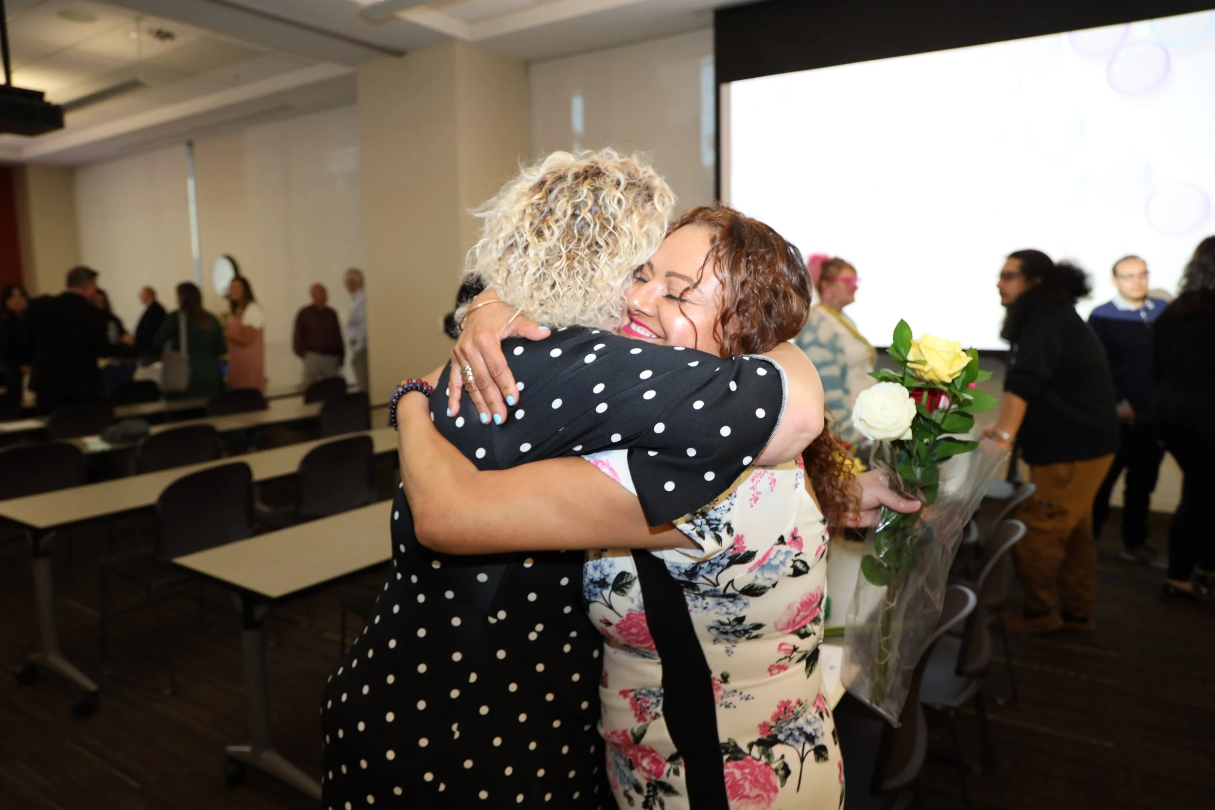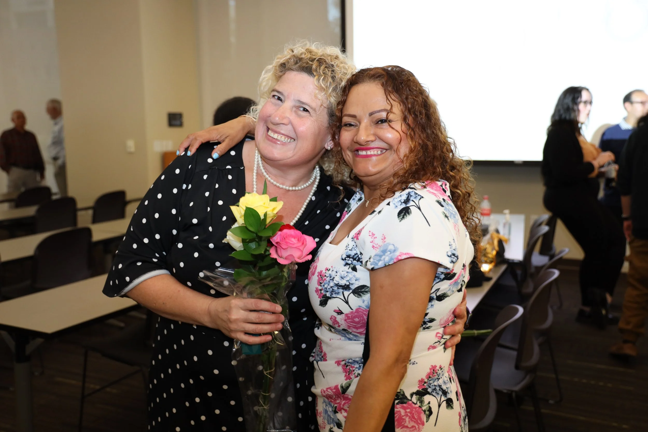 Two women smiling and hugging in a conference room, one wearing a black polka dot blouse and pearl necklace, the other in a floral shirt holding a bouquet of yellow and white roses.