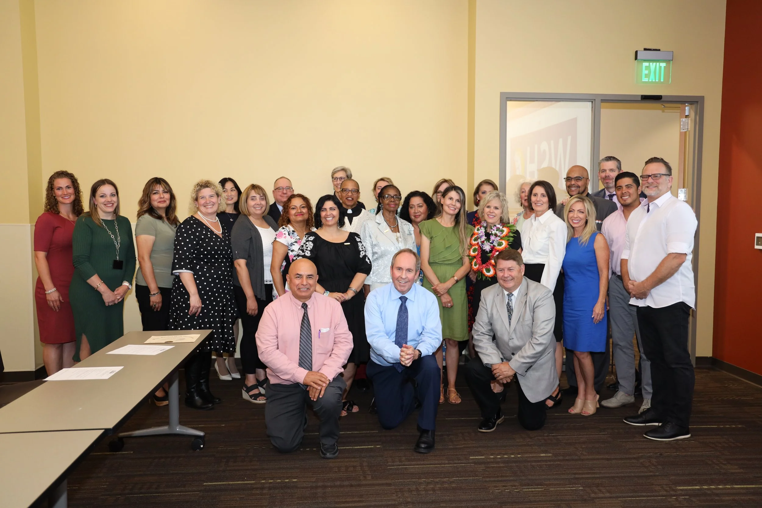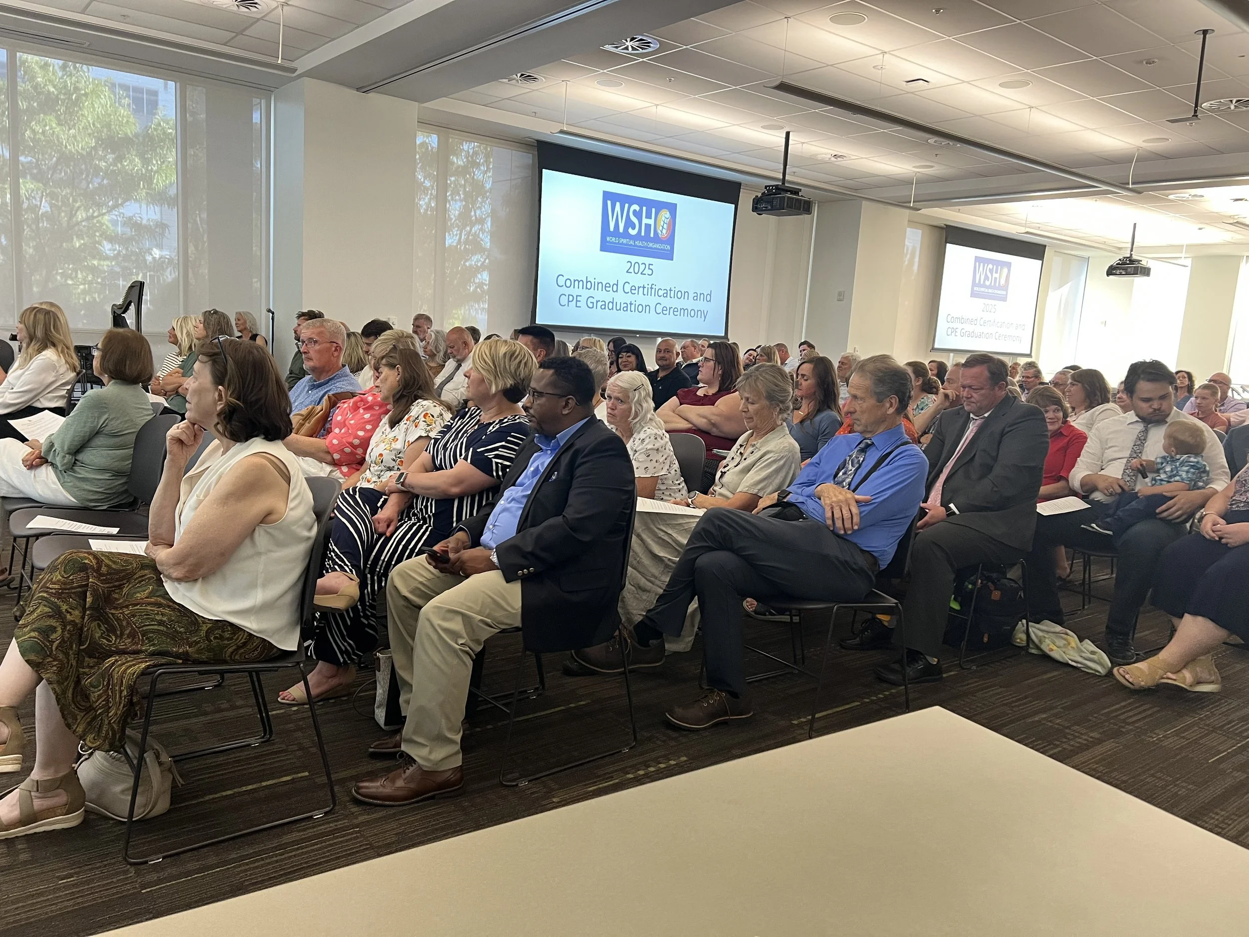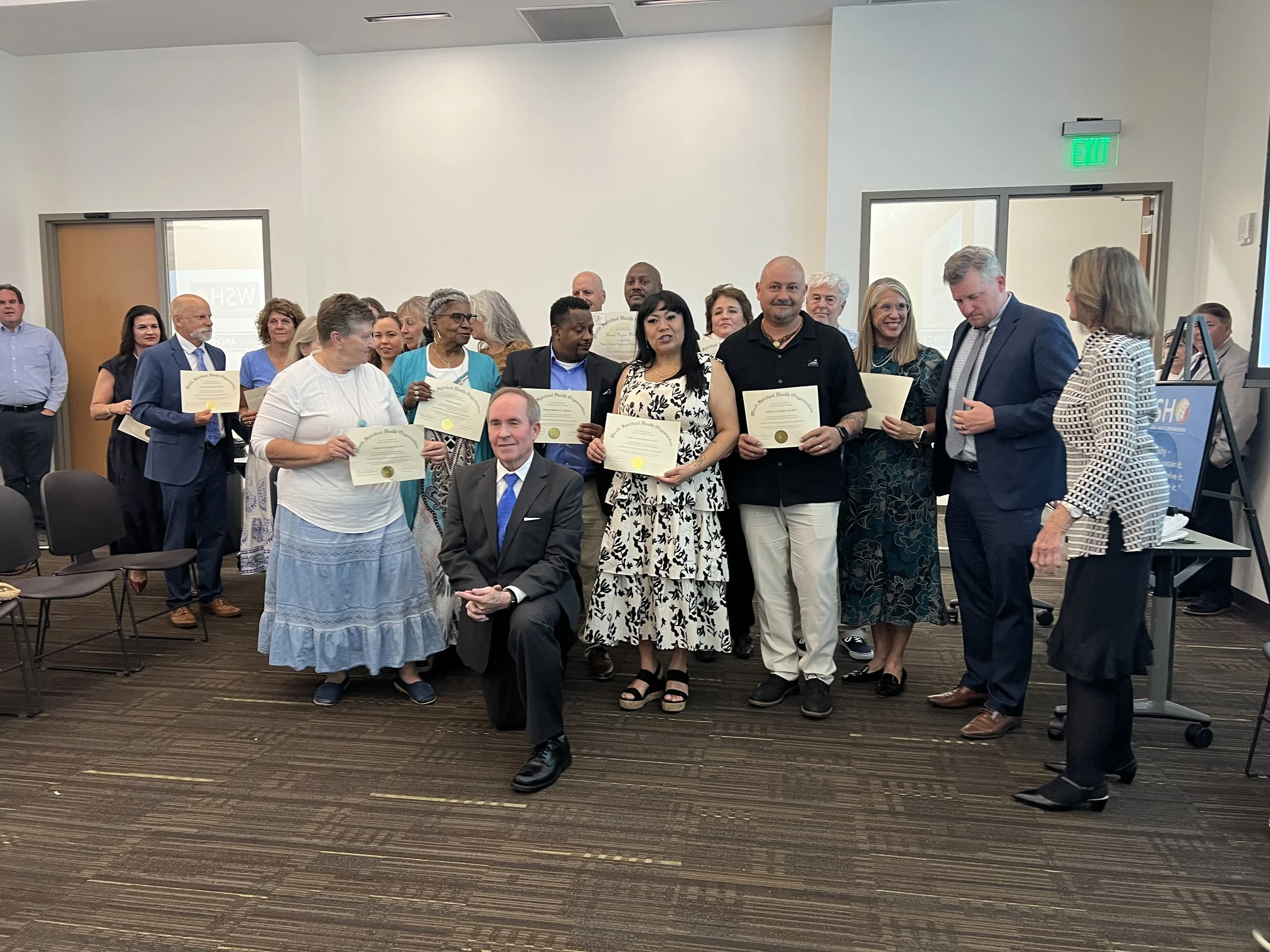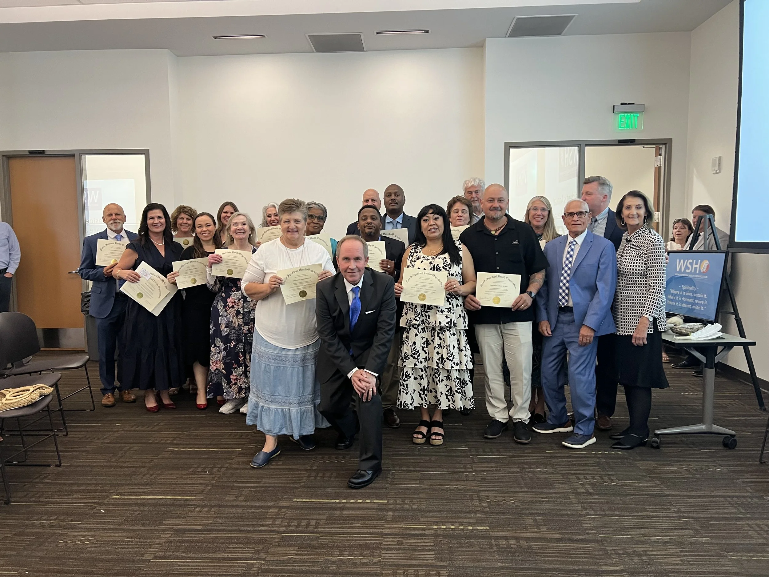Group of seven people celebrating with certificates and flowers in front of a large screen displaying the logo of WSH.