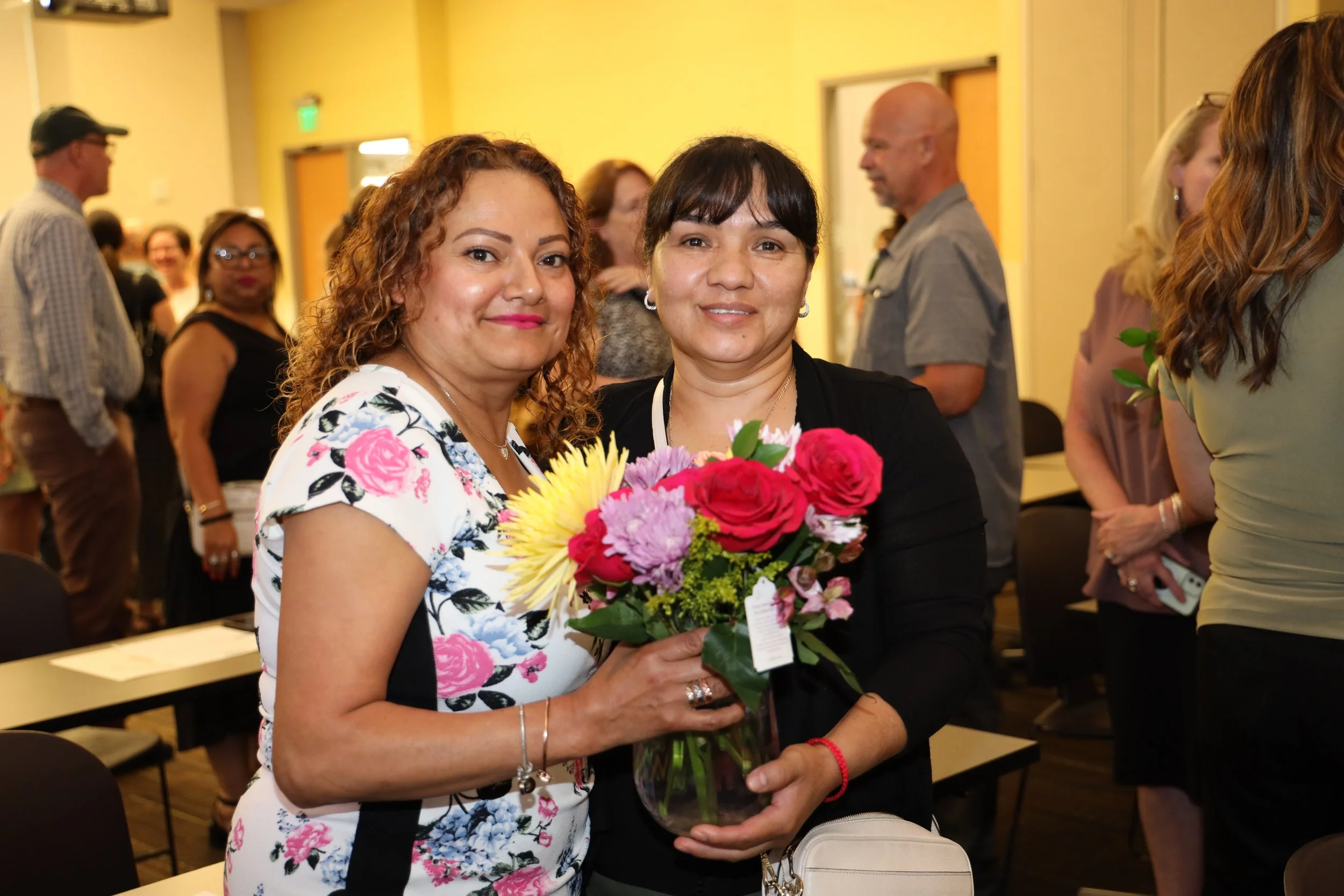 Two women smiling and holding a colorful bouquet of flowers at an indoor gathering with other people in the background.