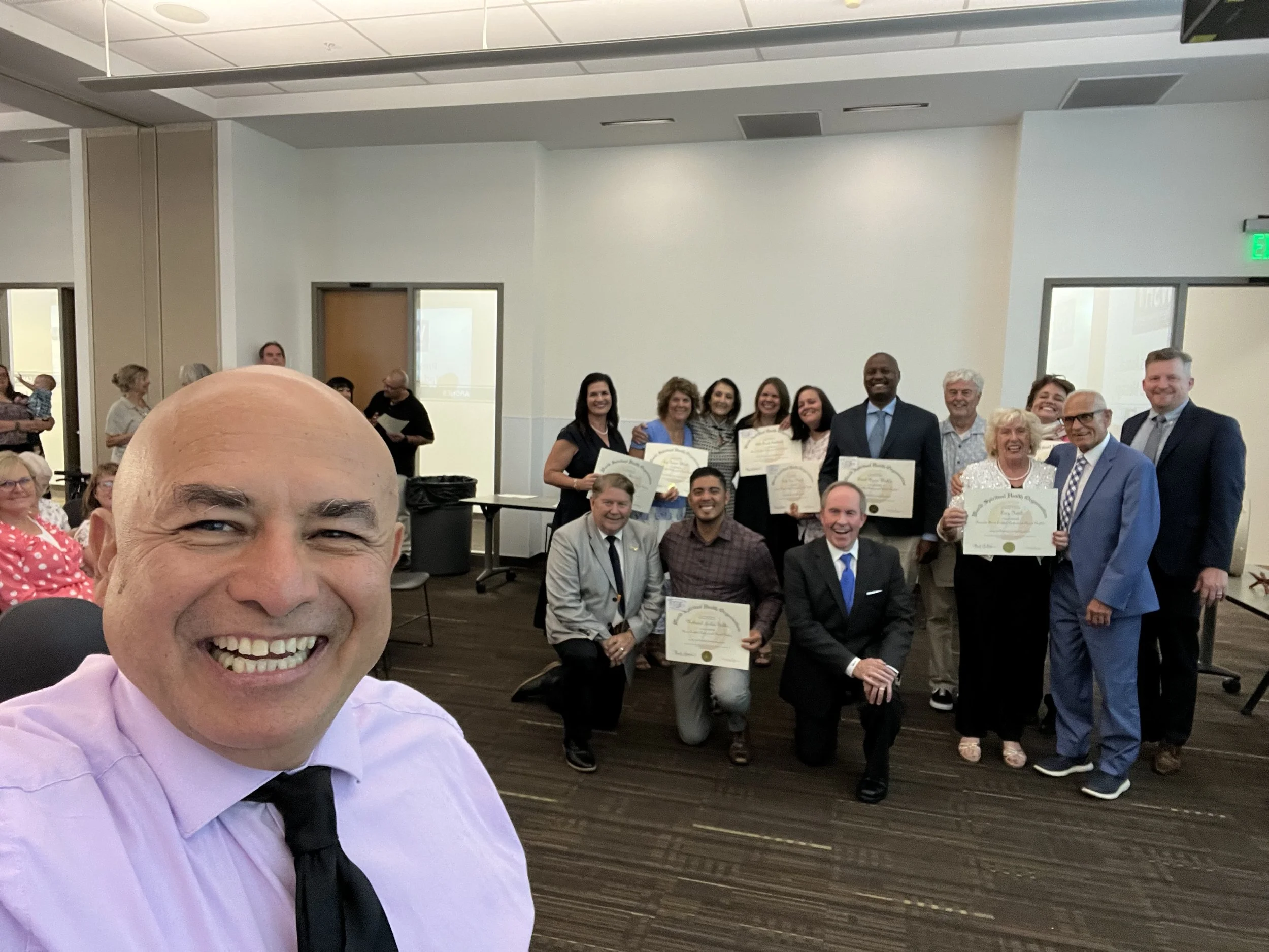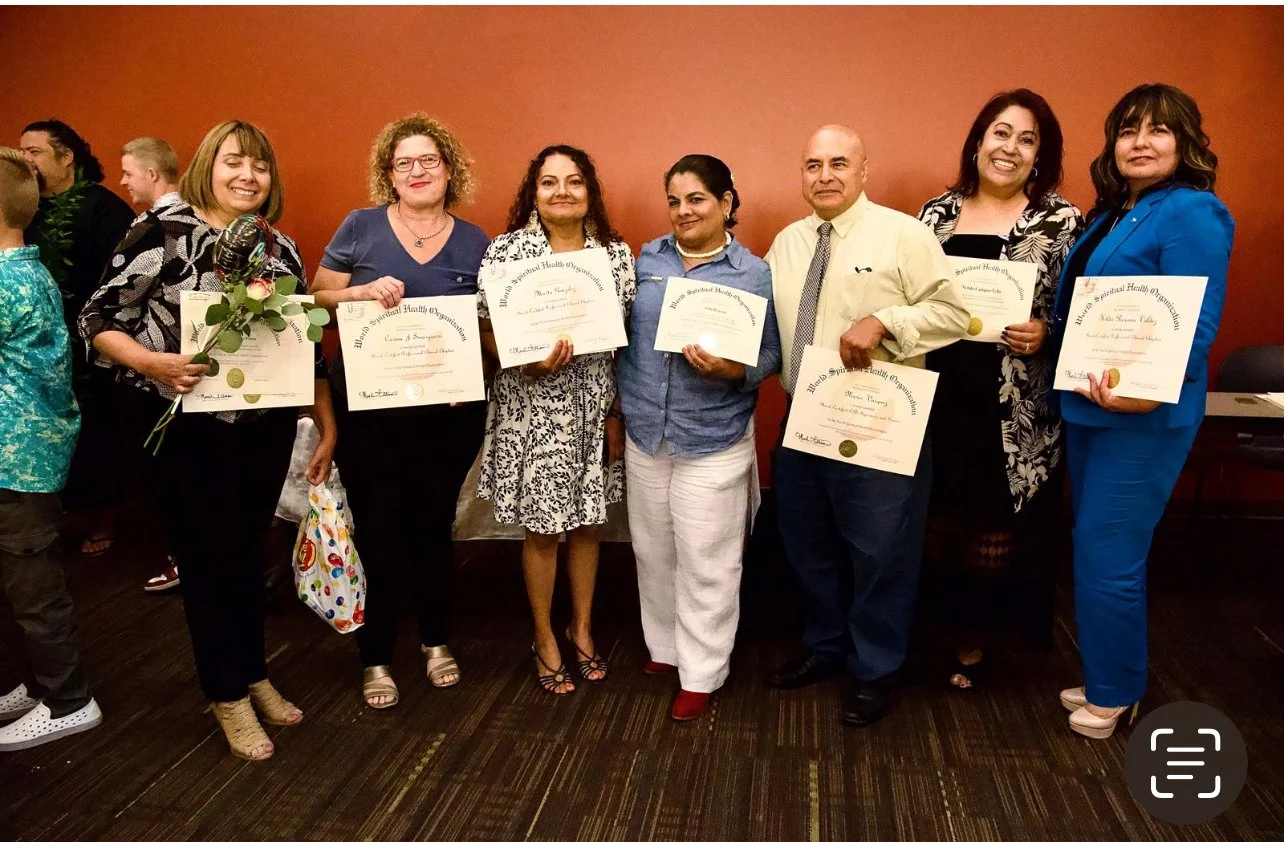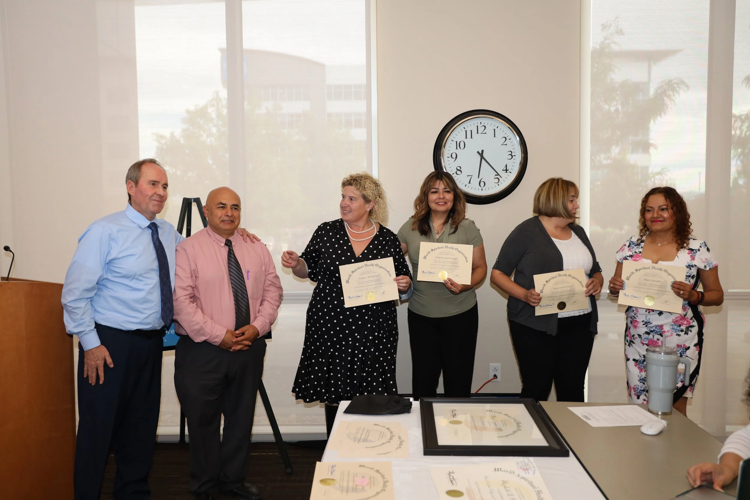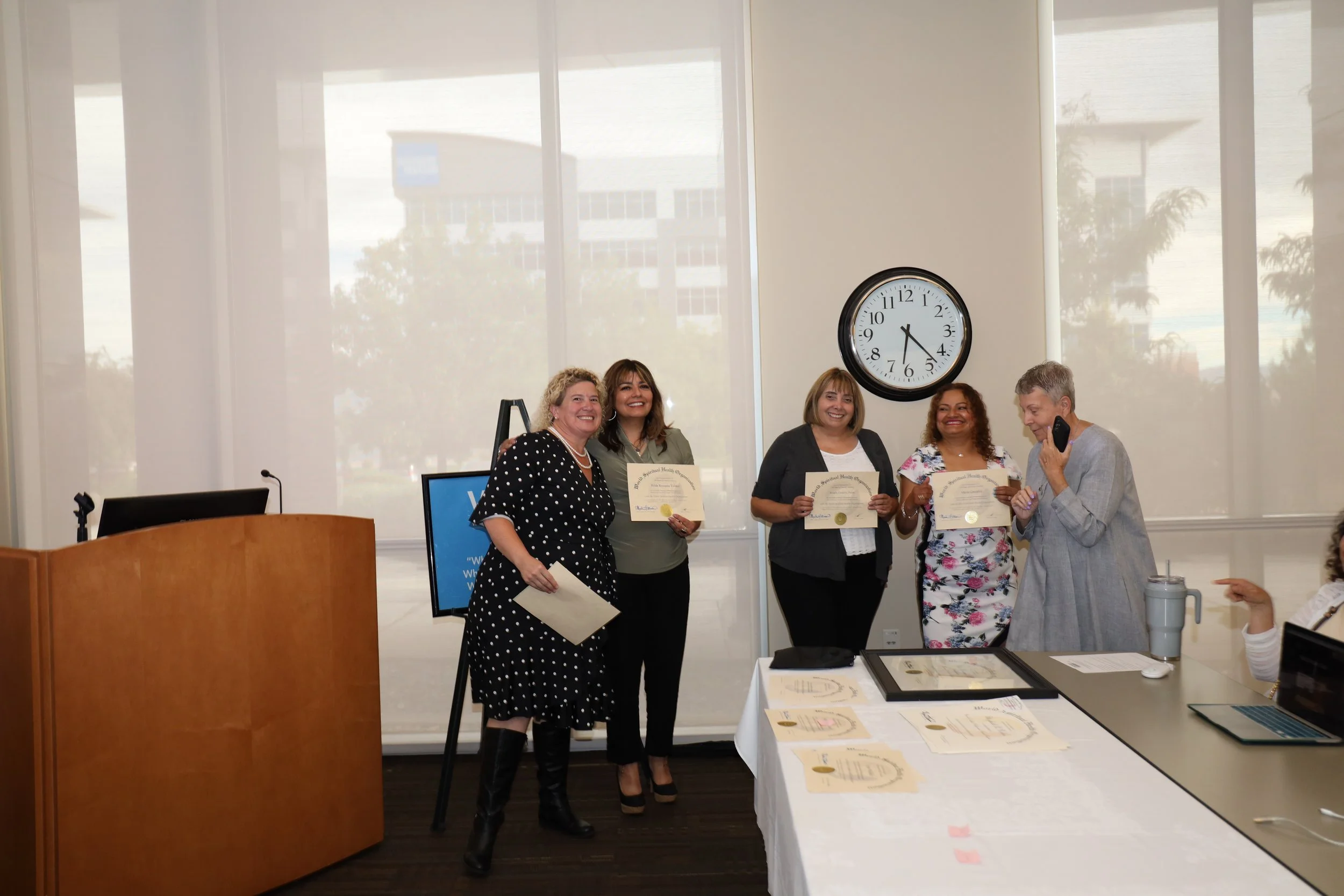 Six diverse individuals standing in a room holding certificates, with a clock on the wall showing 4:25, and a table with framed certificates and documents in the foreground.