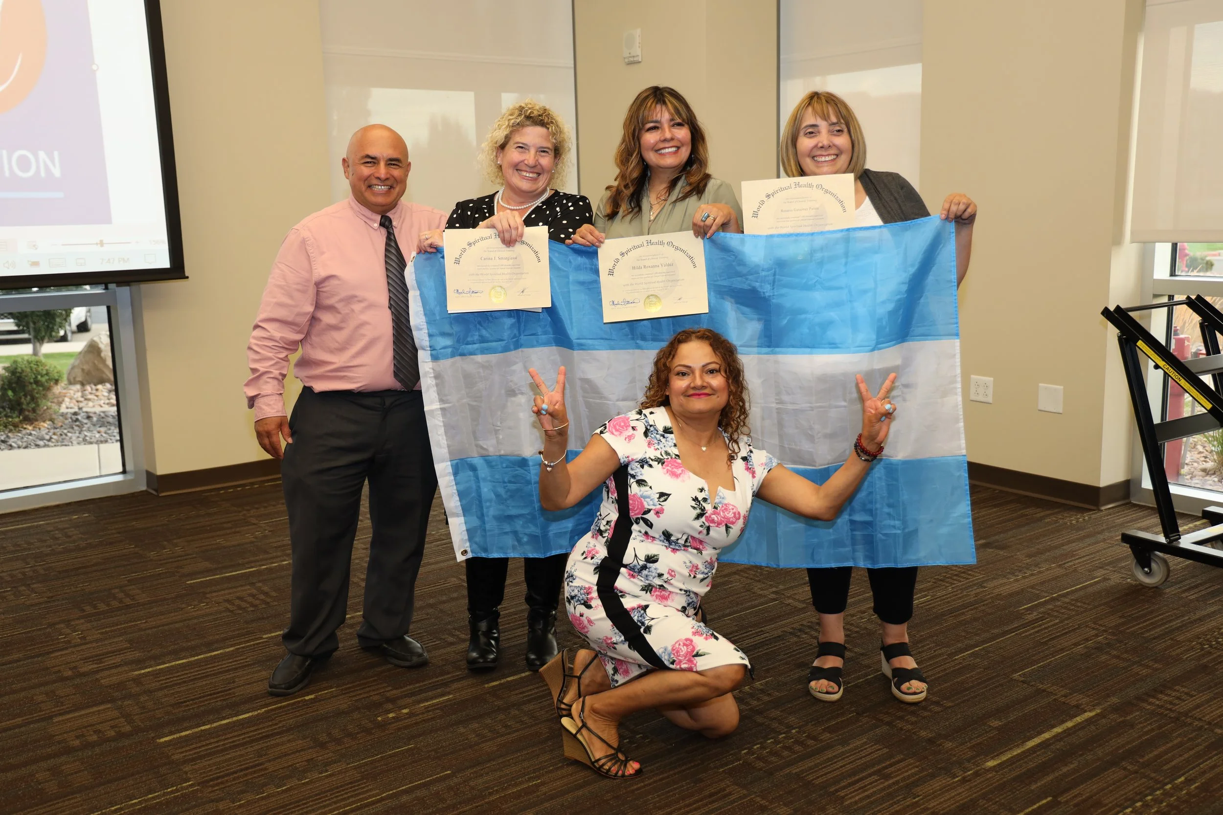 Group of five people celebrating, holding certificates and an Argentine flag, indoors at a professional event.