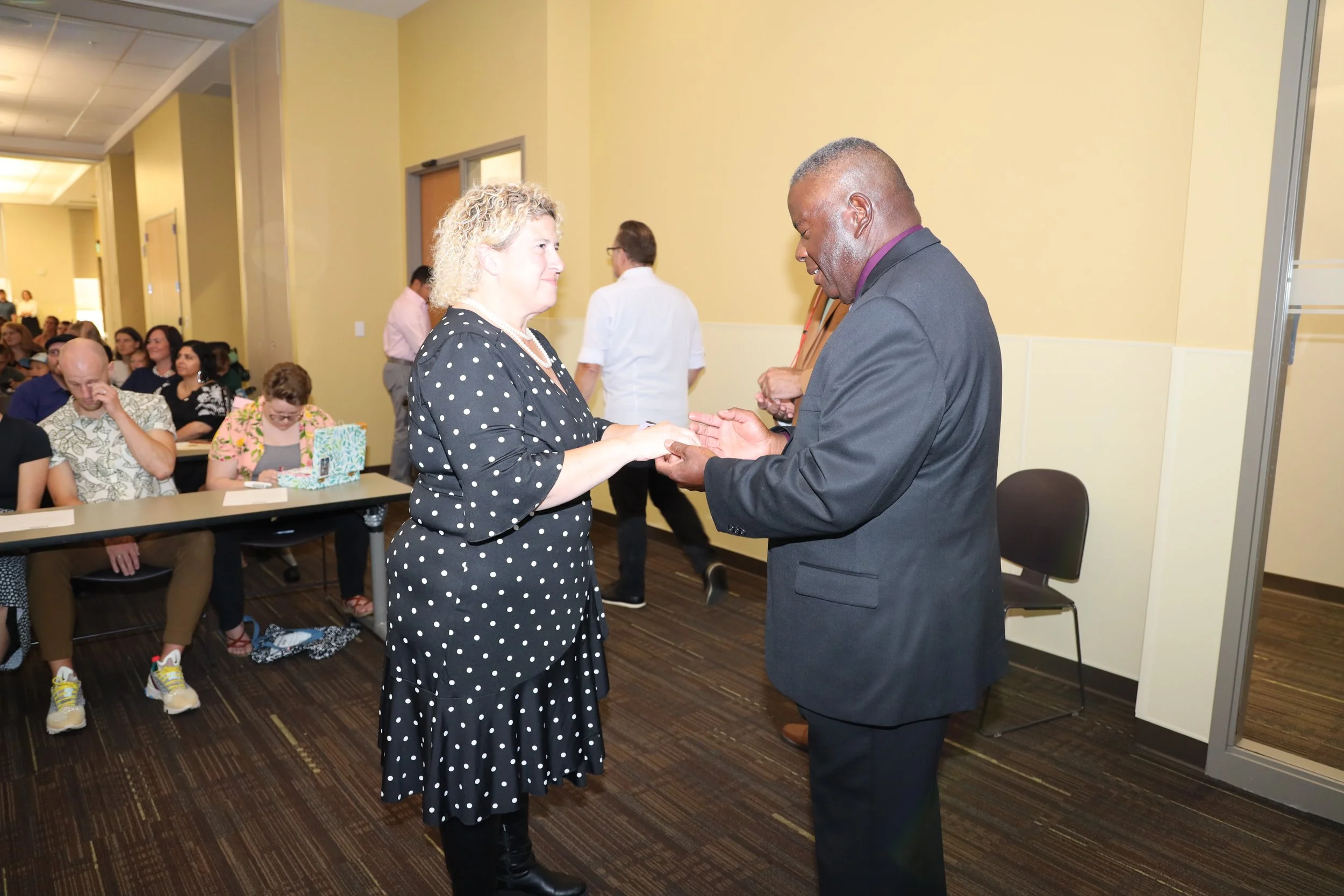 A woman in a black polka dot dress receiving an award or recognition from a man in a suit in a room with an audience seated at tables.