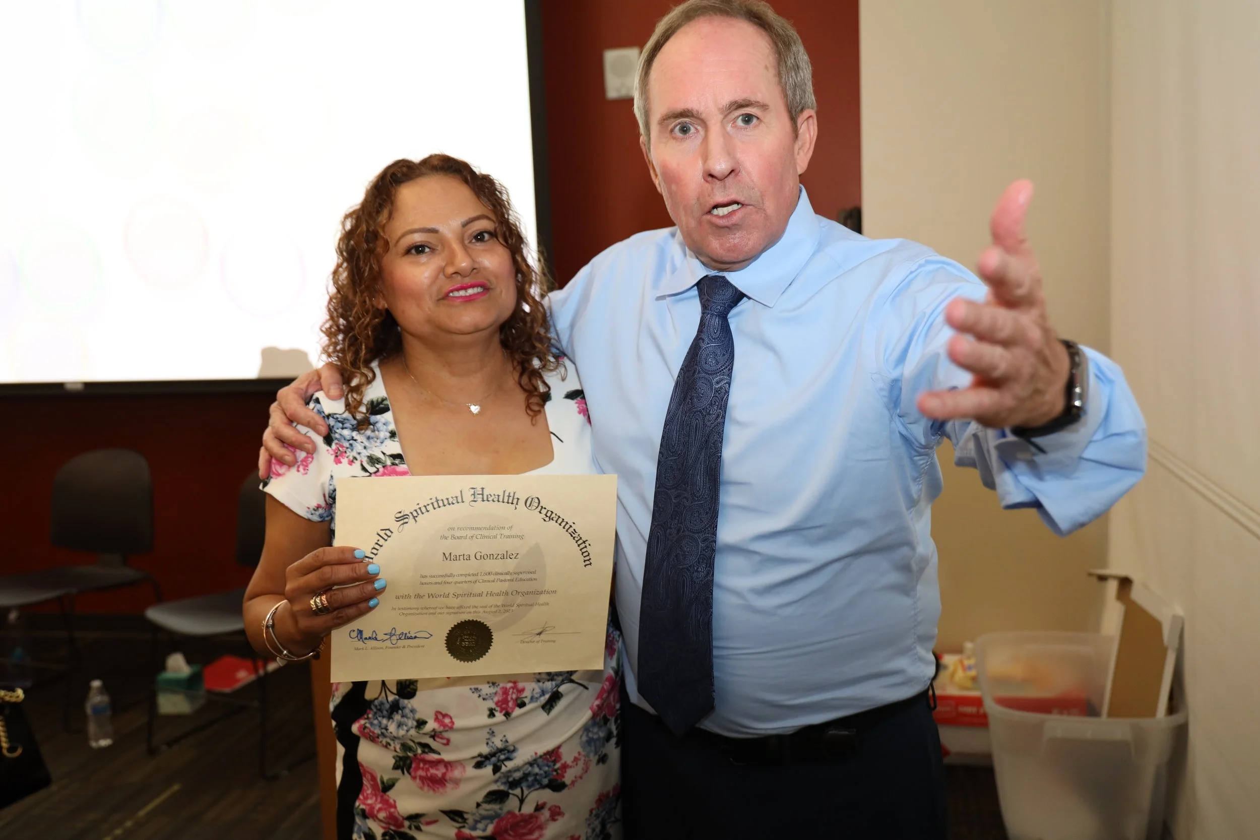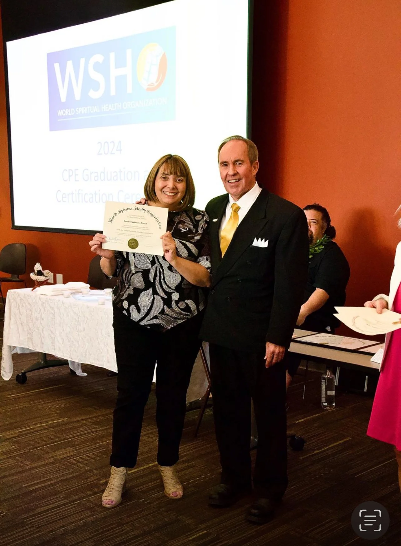 A woman holding a bouquet of white flowers and a certificate standing next to a man. They are smiling and in front of a presentation slide related to world spiritual health organization.