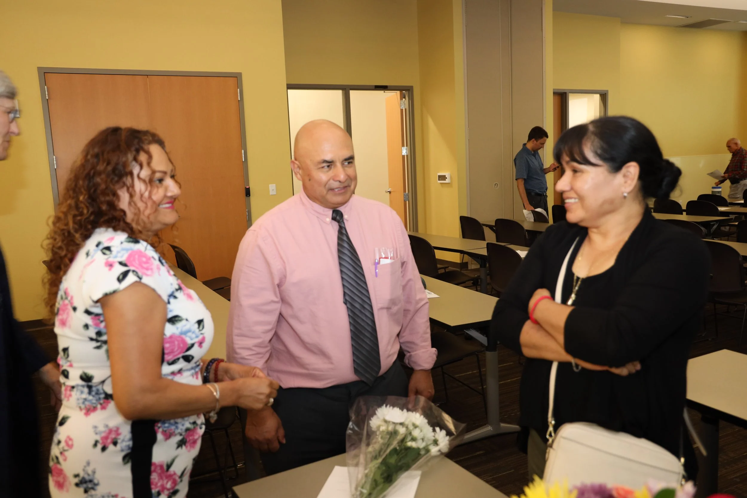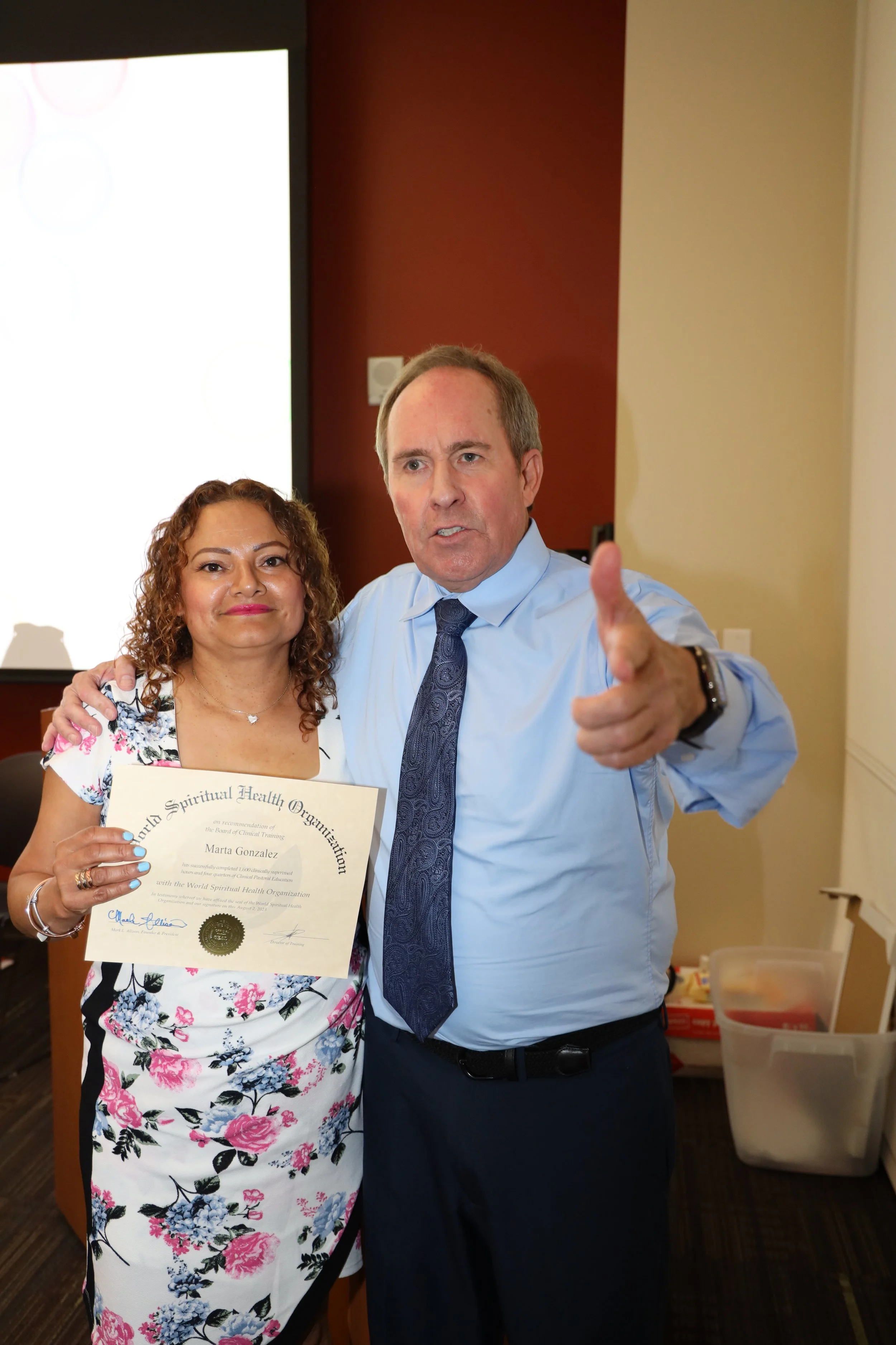 A woman holding a certificate and a man giving a thumbs-up in a conference room. The woman has curly hair, wearing a floral dress, and the man is wearing a light blue shirt and tie.