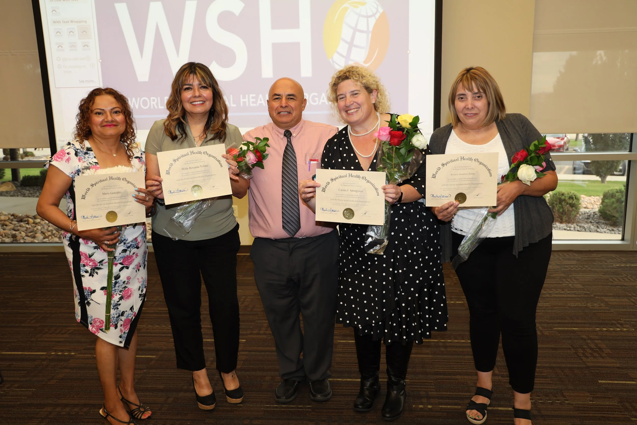 Five people stand together indoors, holding certificates and flowers, smiling. Behind them is a screen with a logo that says 'WSH' and 'World Spiritual Health Organization'.
