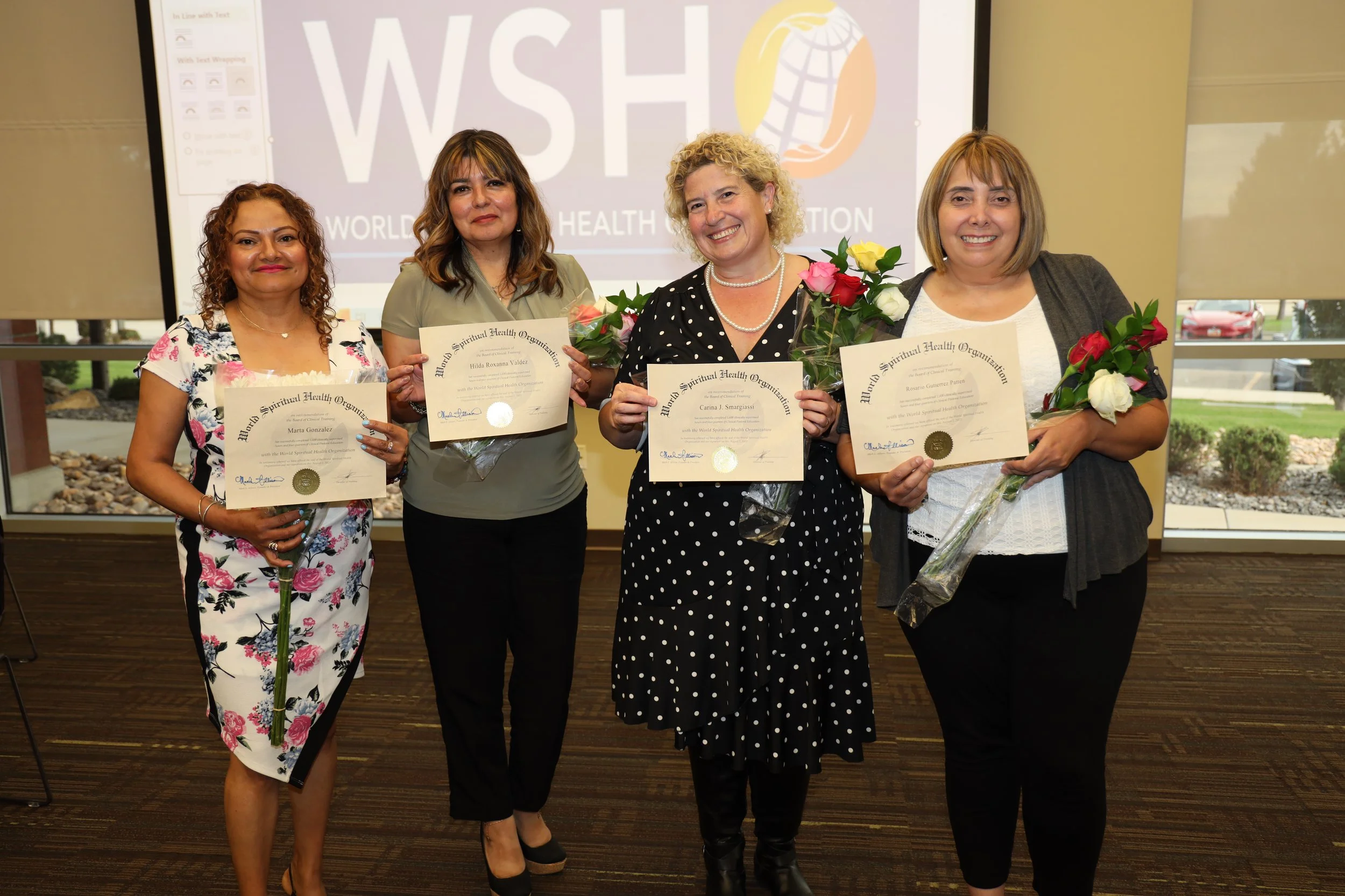 Four women standing indoors, holding certificates and roses, at a recognition event for the World Spiritual Health Organization. The women are smiling and standing in front of a screen displaying the organization's logo.