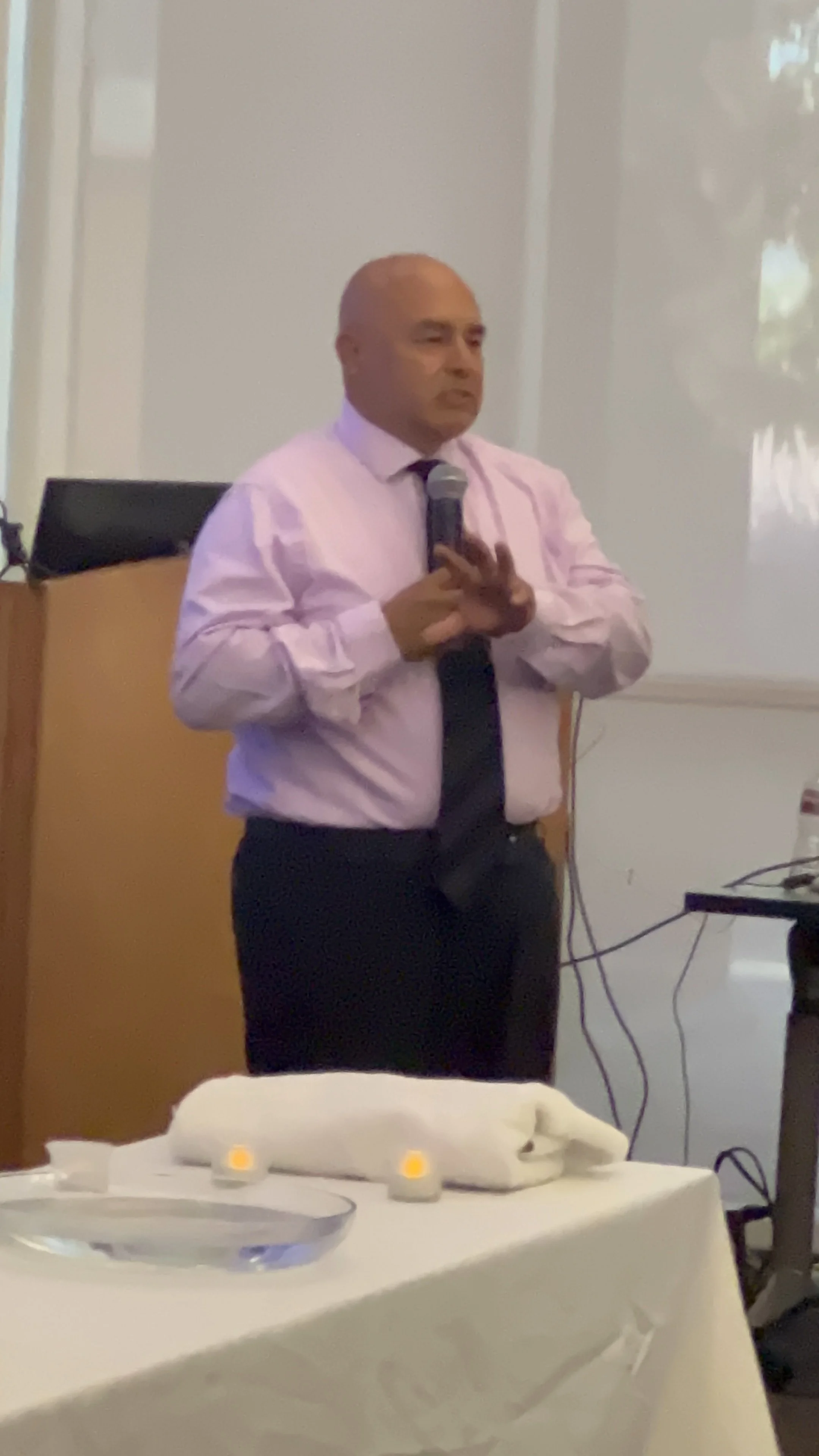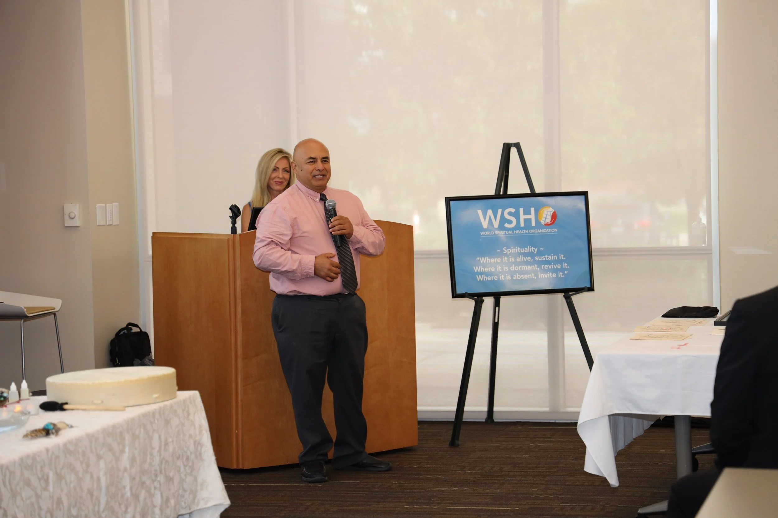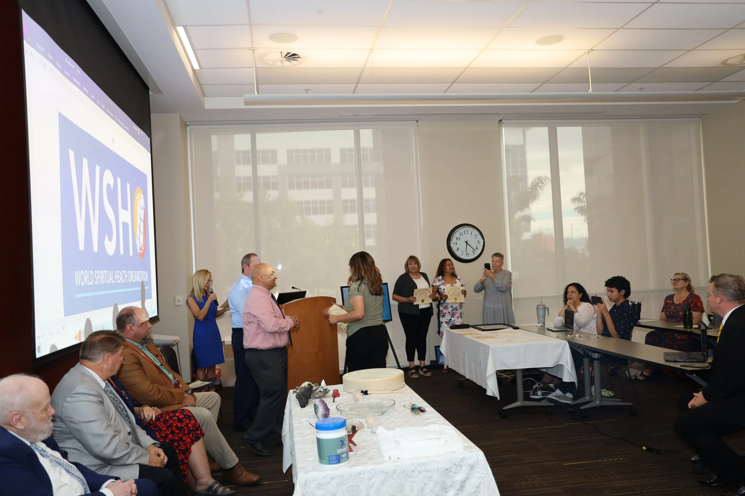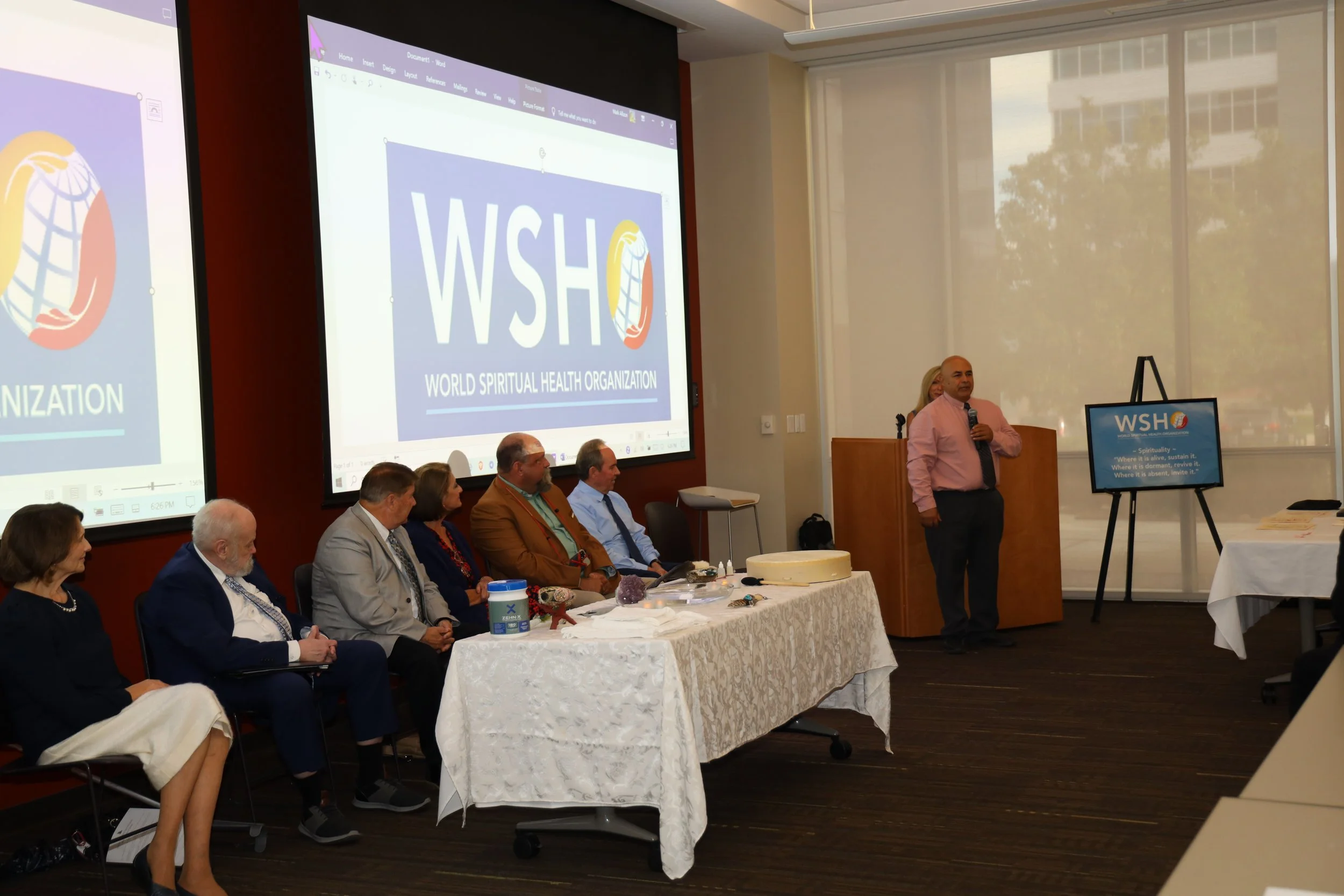 A group of people seated at a table during a presentation for the World Spiritual Health Organization, with a large screen showing the organization’s logo and a speaker standing at a podium.