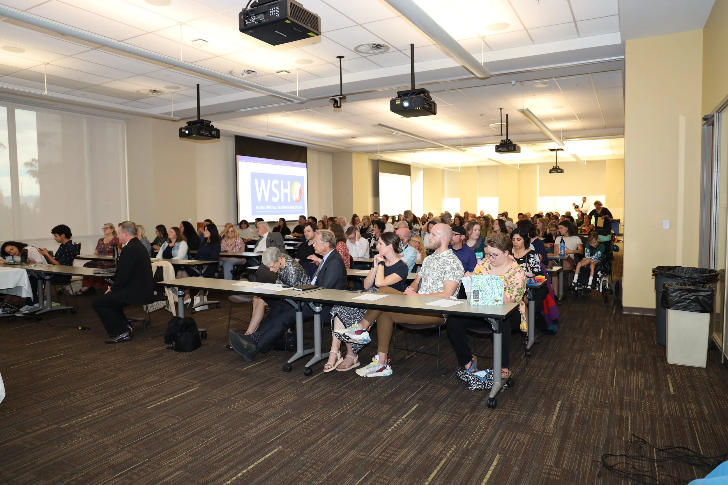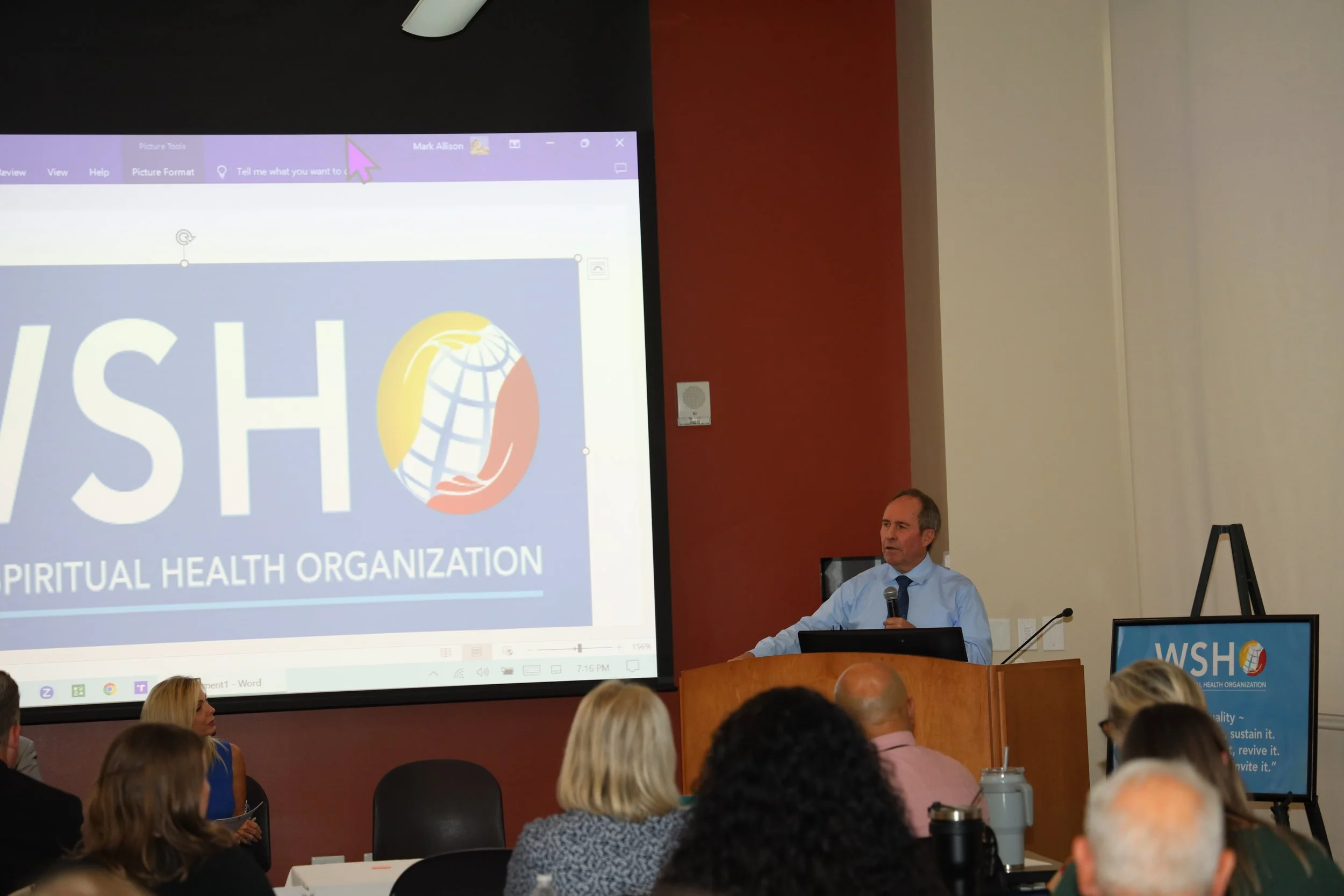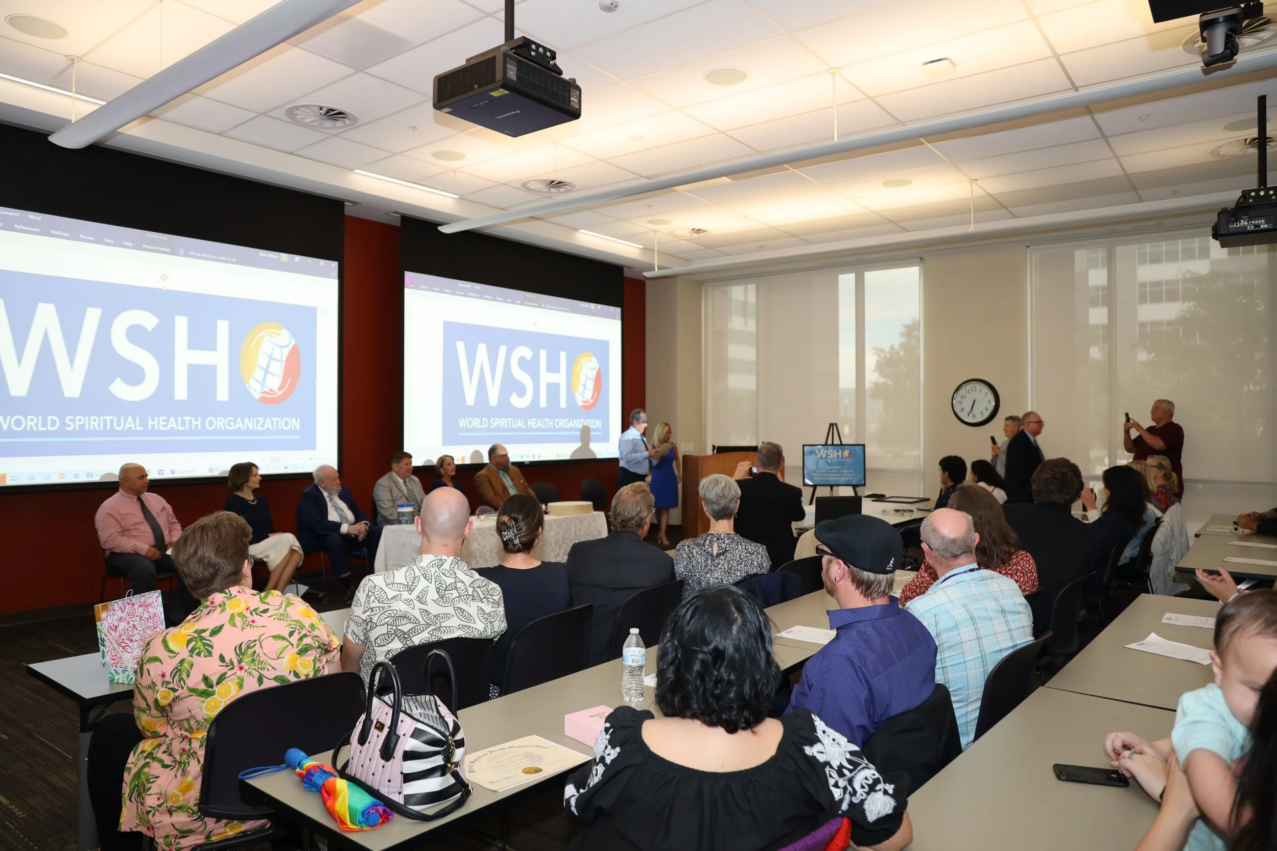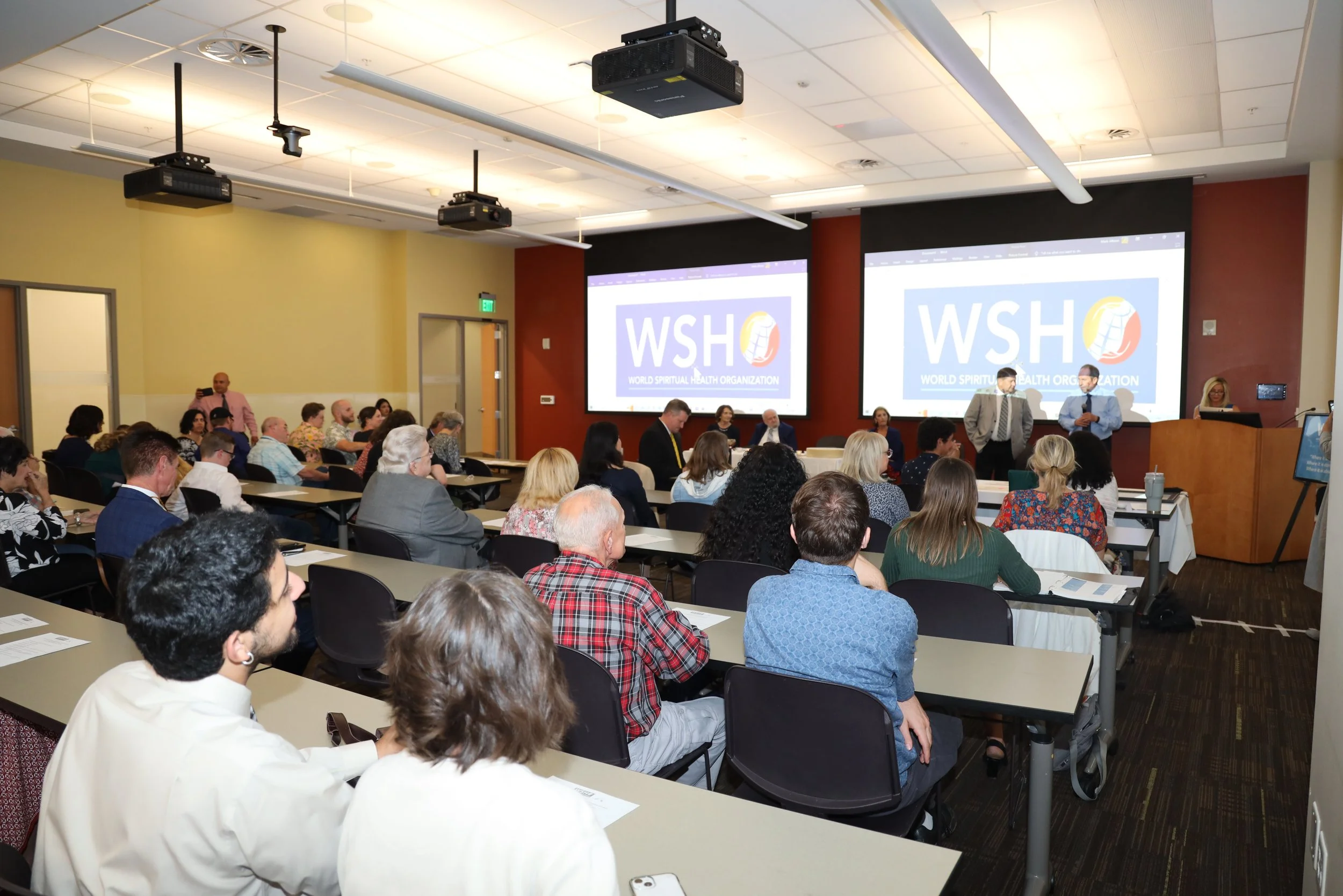 A large conference room filled with seated attendees facing a presentation screen with the logo of the World Spiritual Health Organization (WSHO).