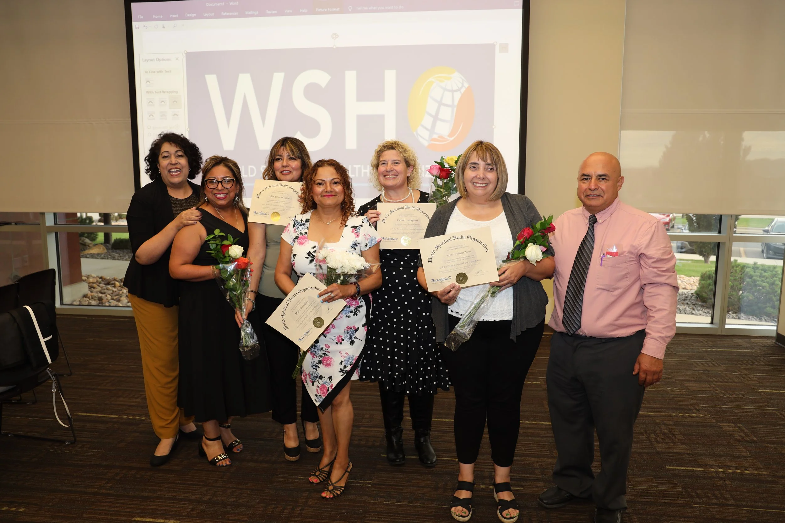 Group of seven people standing indoors holding flowers and certificates, celebrating an achievement or event, with a large projection screen behind them displaying the logo 'WSHO' and a globe image.