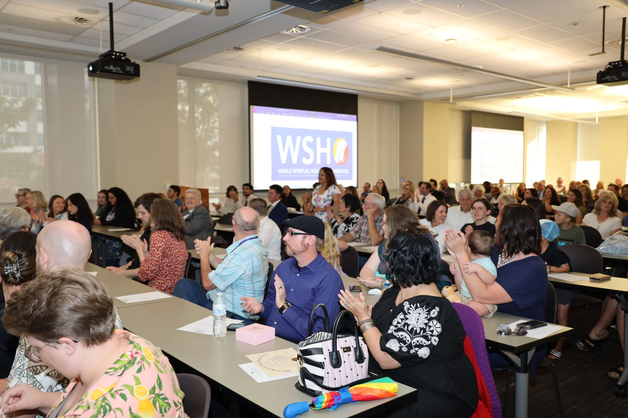 A large conference room filled with diverse attendees seated at tables, clapping, and looking towards a speaker. A woman stands at the front near a projector screen displaying the WSH logo for the World Spiritual Healing Organization.